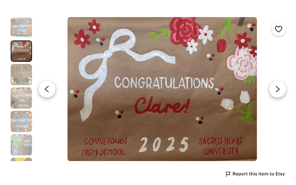 Outside of school, Riley works on several creative side projects where she combines her interests in business with her passion for fan culture. She owns an Etsy shop where she paints and sells handmade banners, while also creating music-related content and sharing it on social media platforms such as Instagram and TikTok. She also sells clothing through Depop and Poshmark. These projects provide Riley with hands-on experience and demonstrate her interest in content creation, audience engagement, and analytics.